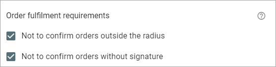 The option which allows drivers to confirm orders only within the specified radius from the place of delivery. The option does not apply to warehouses. The driver can confirm the visit to the warehouse regardless of the location.
