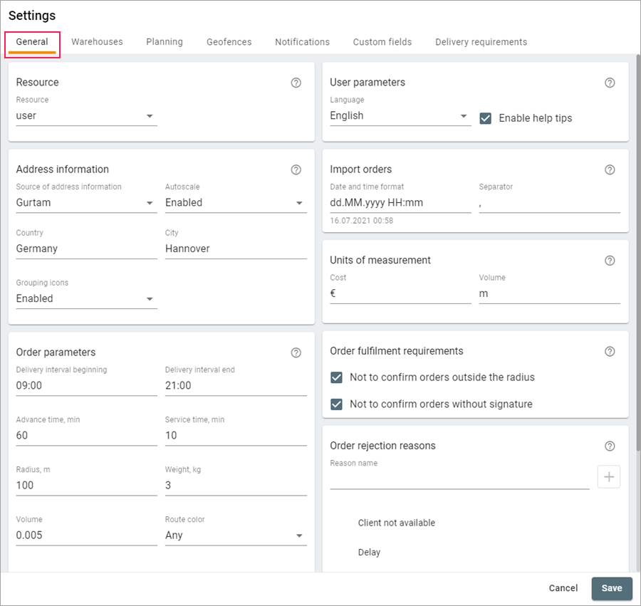 On this tab, you can select the resource, units of measurement, configure the map and the order parameters which should be displayed in the order window by default.