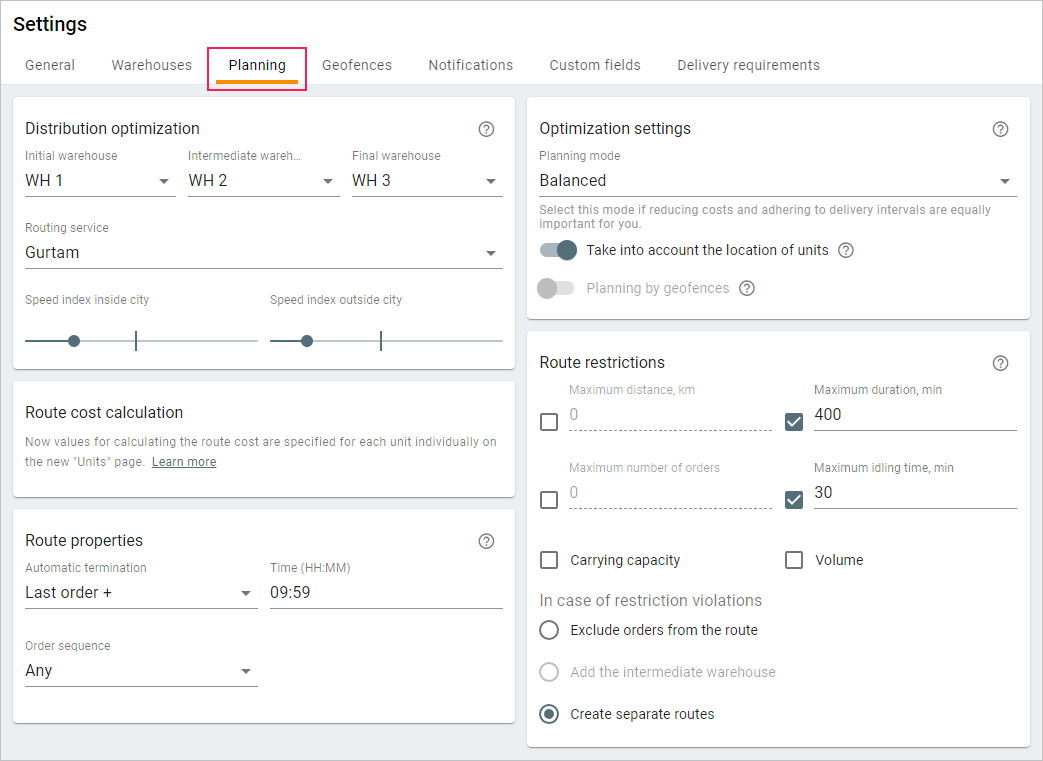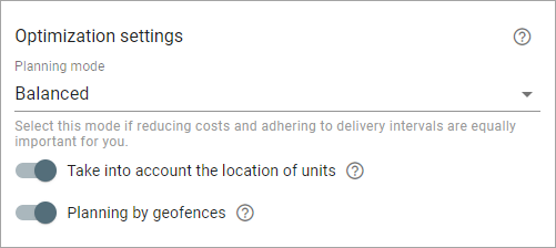 The settings in this section influence the level of expenses related to the fulfilment of routes. The section also contains the options which allow taking into account the location of the units and their attachment to geofences while planning.