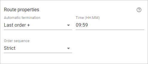 | Last order + | The route ends after the time interval specified in the Time field. This interval is counted from the estimated time of visiting the last point, taking into account the service time. |