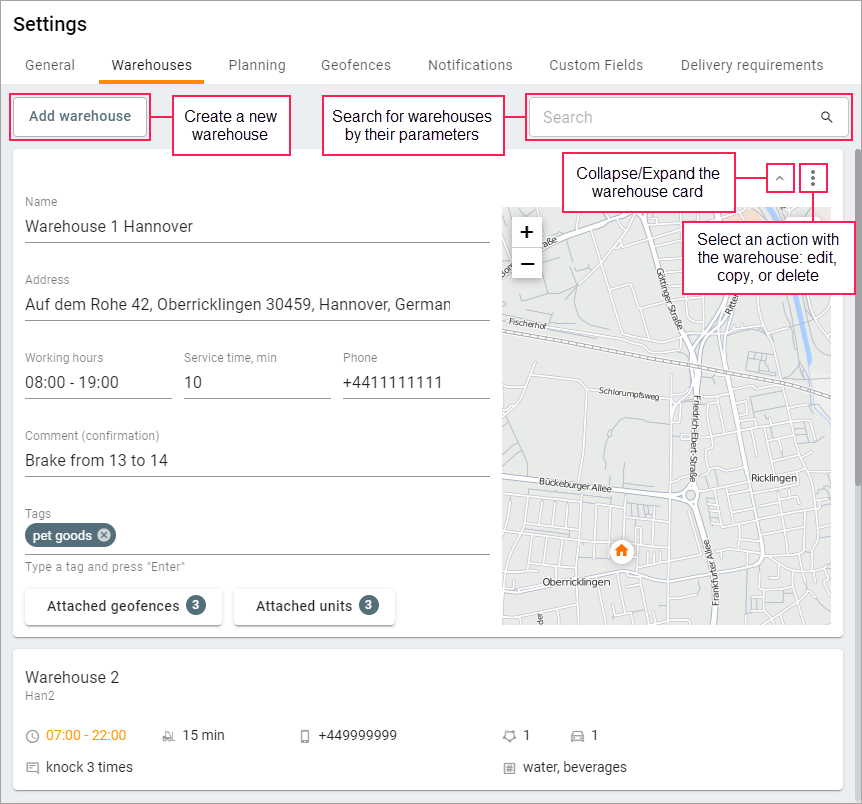 On this tab, you can create, copy, and delete warehouses. You can add a warehouse as the first, intermediate, and last point on the Planning tab.