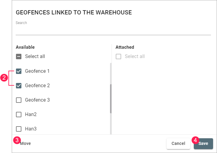 - Find and select the geofence you want to attach to the warehouse.