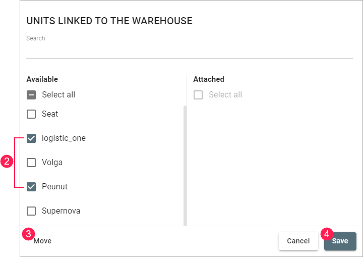 - Find and select the unit you want to attach to the warehouse.