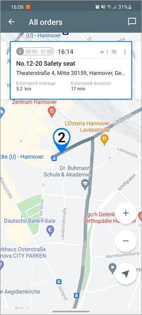 Tap an order from the order list to go to the map which is scaled and centered on the selected order. On the map, you can go from one order to another by moving the order cards to the left or right in the upper part of the screen.