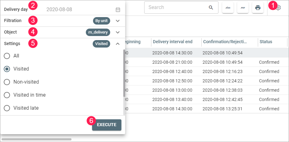 - In the Settings field, select what orders should be included in the report: all, visited, non-visited, visited in time, visited late, confirmed, rejected.