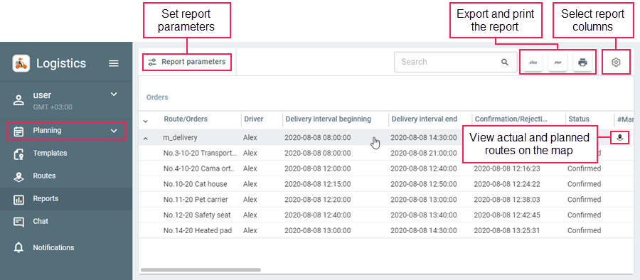 In this section, you can get information about active, planned and fulfilled routes in the form of reports. The reports are required for analyzing key parameters and optimizing the courier’s work.