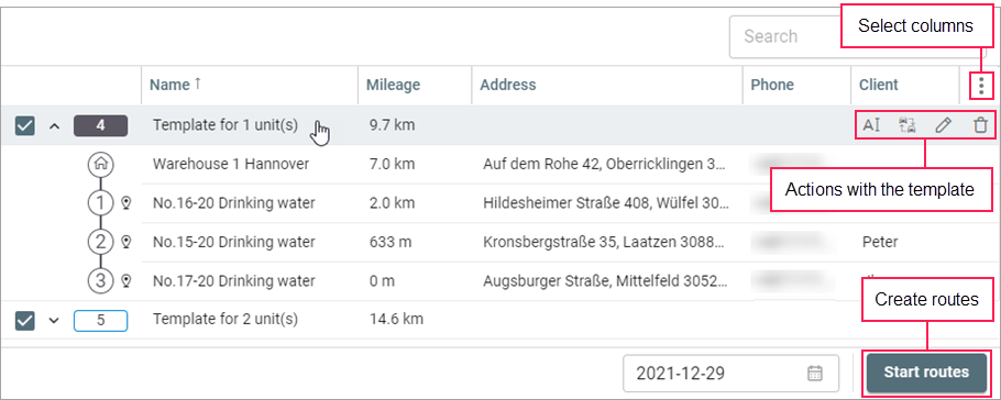 To create a route on the basis of a template, select it in the table, choose a date and click Start routes. After that, the route will appear on the Routes page among the planned or active routes.