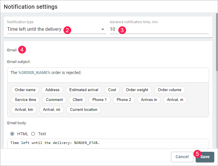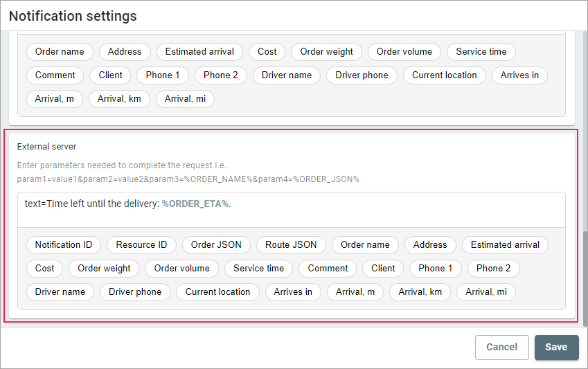 | Orders ready to be sent | A notification of this type is triggered N minutes before the beginning of the route. The number of minutes is specified in the Advance notification field. The notification is sent to all the clients specified in the orders of the route. |