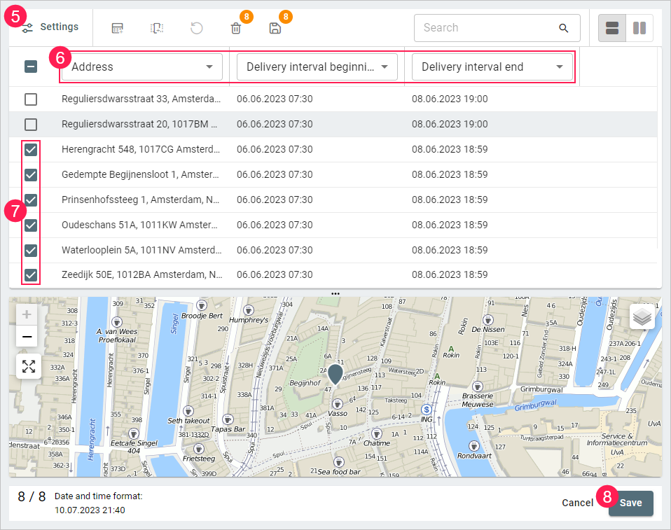 After selecting the required columns, such as Address, Delivery interval beginning and Delivery interval end, their contents are checked for validity. Fields with invalid values, for example, incorrect address or date format, are marked with the icon