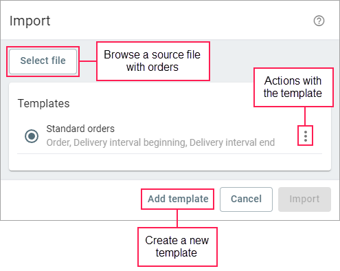 Import templates are column headings saved in a certain sequence. They are required so as not to select column names in the import table manually. You can create templates in the window of selecting a file for import (the Add template button) or in the table at the next stage of import (the icon