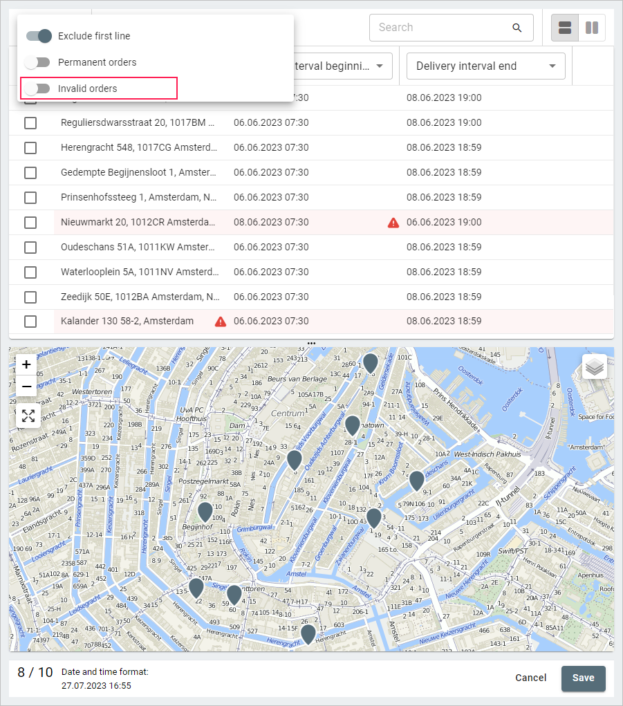 . To show only orders with invalid values in the table, enable the Invalid orders filter in the settings in the upper left part of the table.