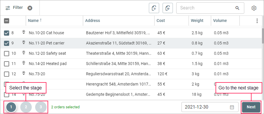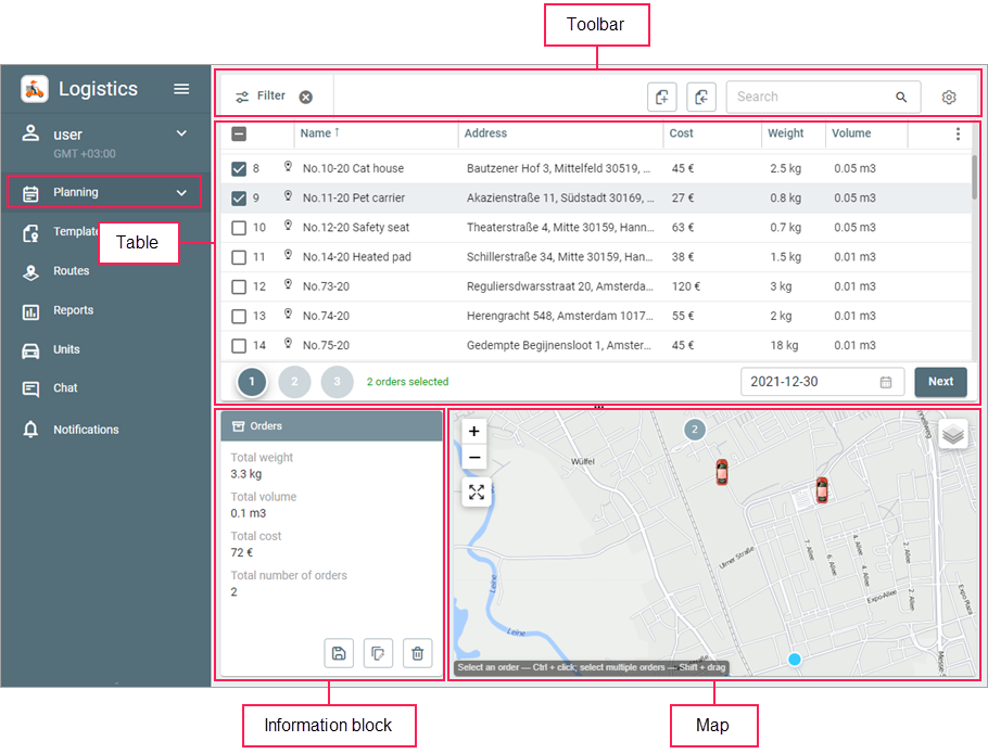 - table, the content of which changes depending on the planning stage (selection of orders and delivery dates, selection of units for fulfilling the orders and creating a route);