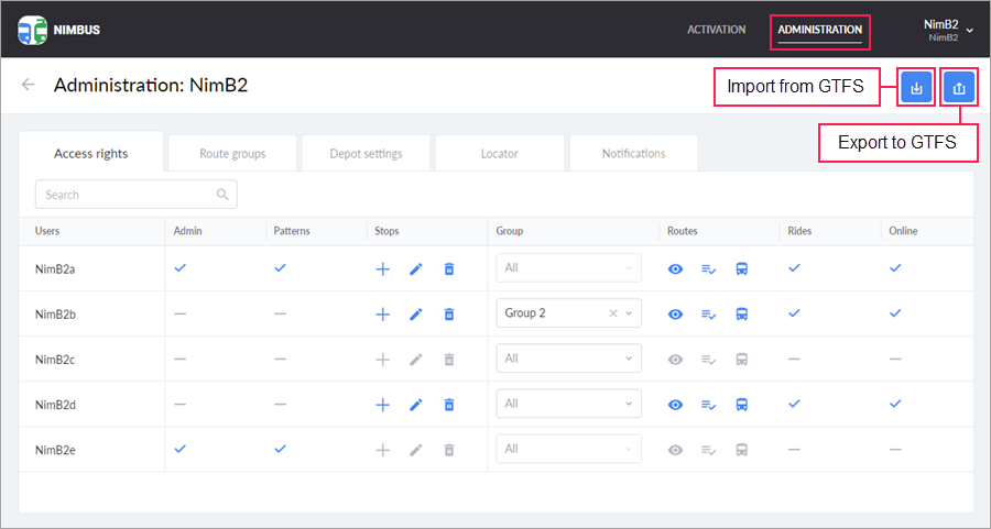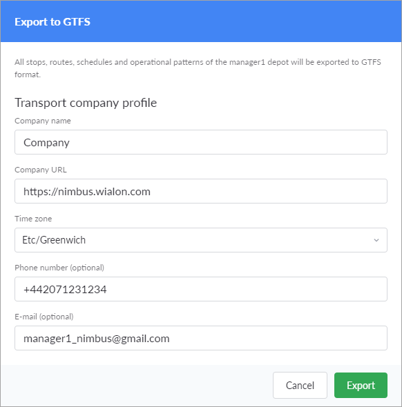 You can export stops, routes, schedules and operation patterns to a GTFS file. You can use this option to integrate NimBus with external systems, to back up data and transfer it from one account to another.