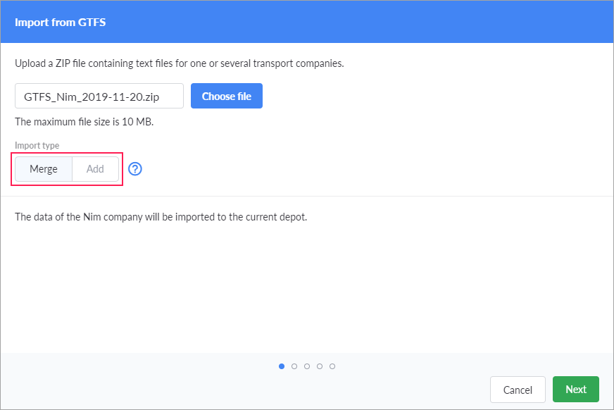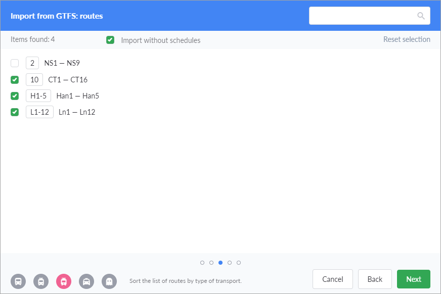 In the next steps, select the stops, routes, and operation patterns you want to import. Stops can be assigned one or several types of transport (bus, trolleybus, tram, route taxi). For routes, filtering by the type of transport and the option of import without schedules are available. If you select the Merge import type and activate the option of import without schedules, the schedules of the routes that have the same name are deleted.