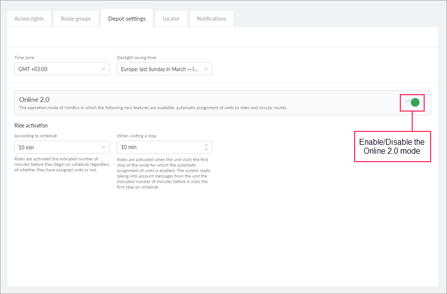 Here you can specify the time zone to which the depot belongs, the daylight saving time period, if applicable, and the ride activation time.