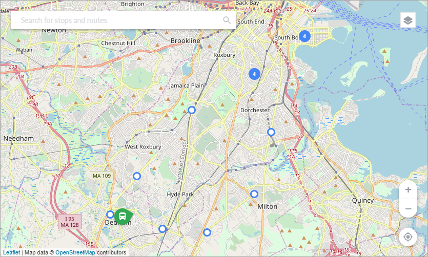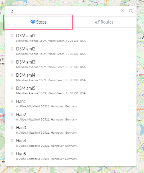 In the upper-left corner of the locator, there is a search which works by stops or routes, depending on the option selected under the input field.