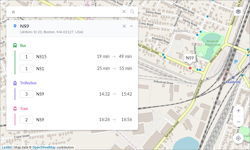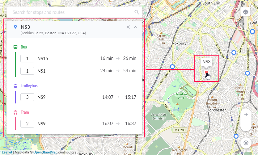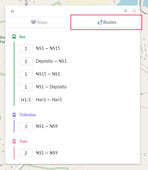 If you click on a stop marker on the map, the name of the stop and its address are displayed in the menu under the search bar as well as the list of all the transport routes to which it belongs.