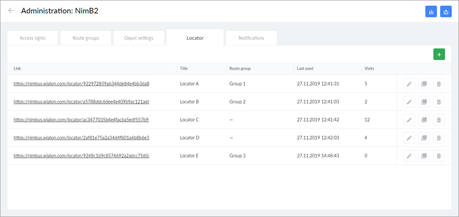 The created links are displayed in chronological order in the table. Here you can see the name of each link, its route group (if selected), the time of the last use, and the number of visits. At the end of the line with the link, there are buttons for its editing, copying to the clipboard, and deleting.