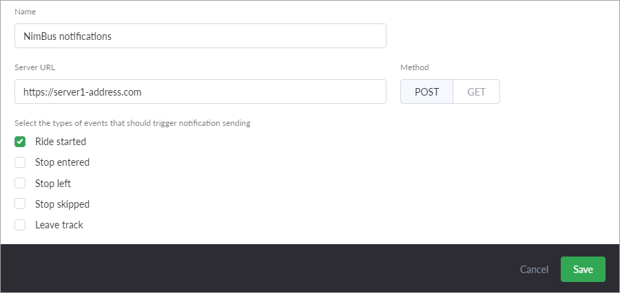 - types of events that should trigger notification sending (ride started, stop entered, stop left, stop skipped, leave track). You can select several types.