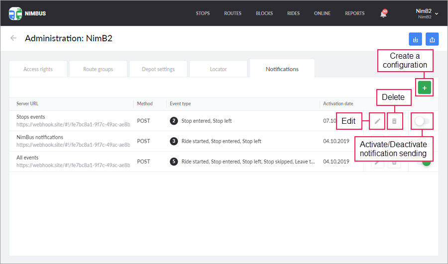 On the Notifications tab, you can configure notifications about the events in NimBus to be sent to external servers. This option is useful, for example, when developing custom solutions based on NimBus data.