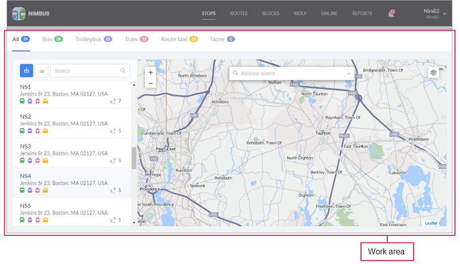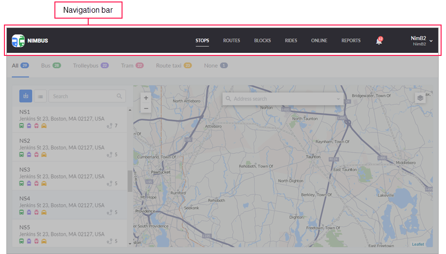In the user interface, the main work with the application is carried out: creating stops, routes, and so on, tracking rides, executing reports. It is available to users for whom the depot is activated.