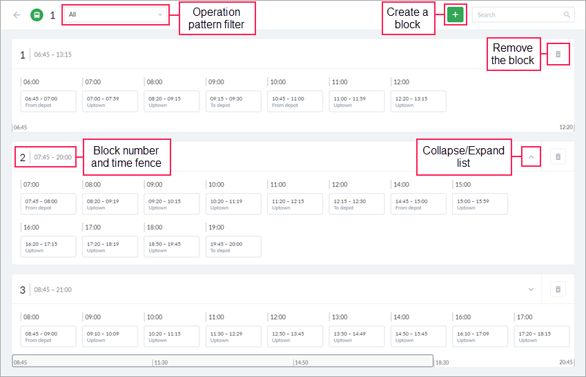 To the right of the block number, you can see the time of its start and end (from the first point of the first schedule till the last point of the last ride). In the upper-right corner of each set of blocks, there is the delete button (