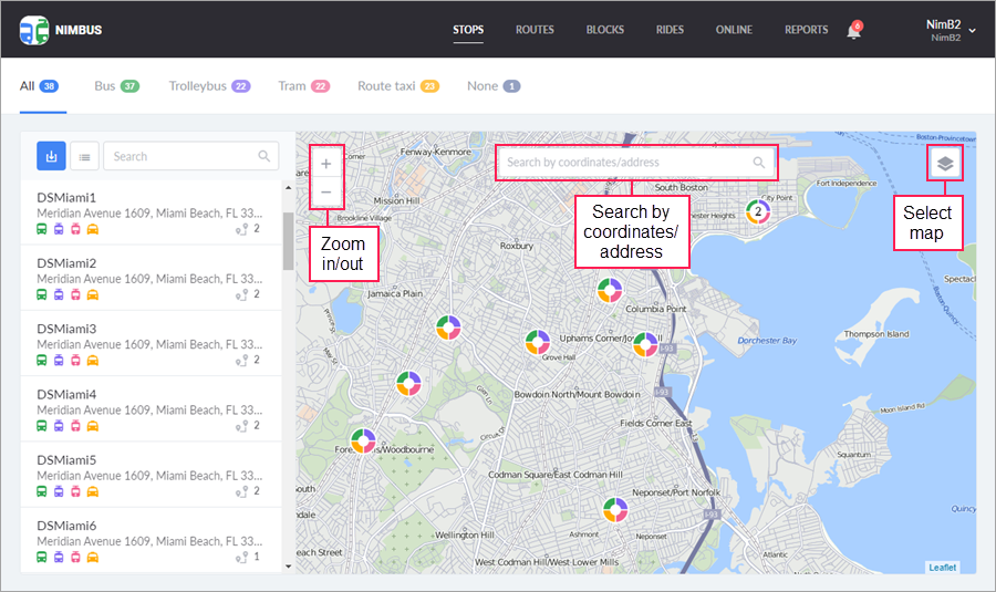 Map is available on the Stops, Routes, Online, Reports pages and occupies most of the screen.
