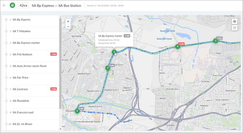 - In the tooltip of a stop, you can see its name and the scheduled time of arrival. For visited stops, the actual time and the hurry or delay time is also specified.