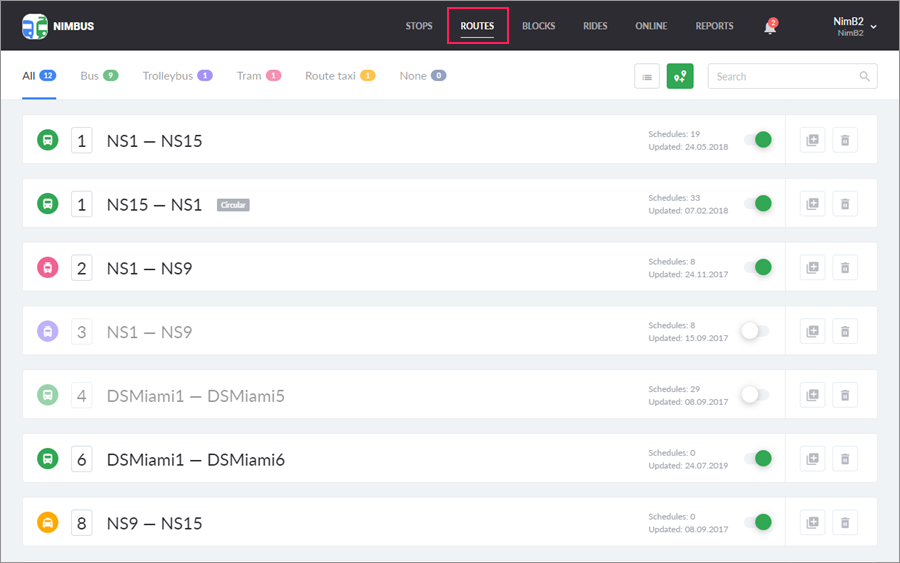 A route is a sequence of stopping points and the path between them. The route in NimBus also includes the entire list of route schedules.