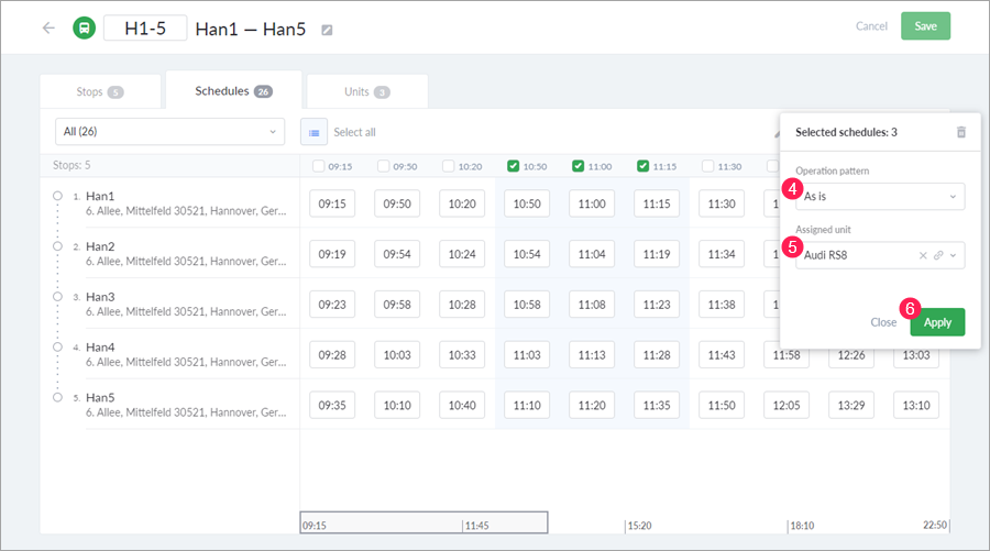 Editing the time for visiting stops is done in the table itself. Additional properties of the schedules (operation patterns, units) are edited in the drop-down menu which you can access by clicking on the pencil icon (