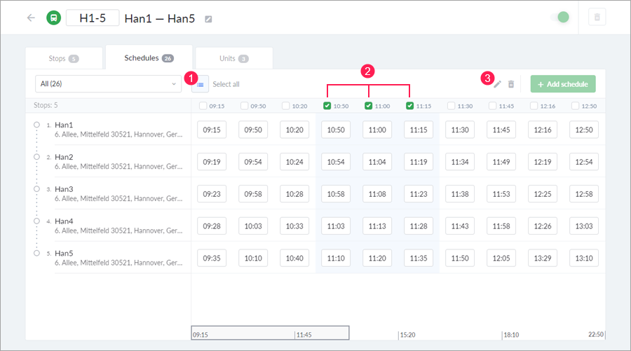 The edited schedules are highlighted in light green. You can view the applied changes in the schedule tooltip. To do this, point to the column heading or to the pencil icon next to it. After making all the changes, save the route.