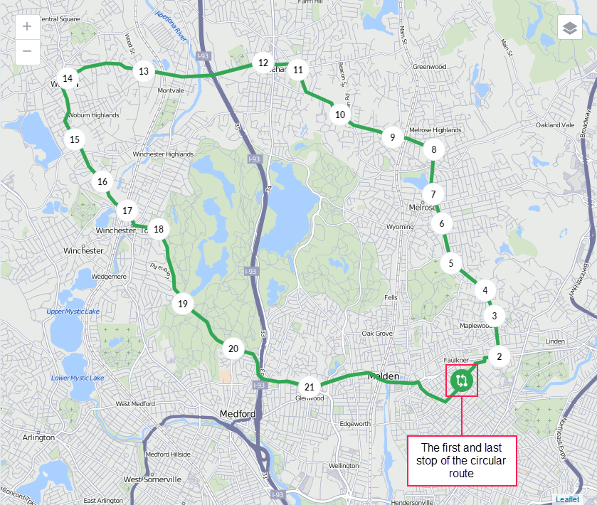 In Online 2.0, you can select the Loop action after clicking on the first stop of the route on the map, and the Unloop action after clicking on the icon of the first and last stop of a circular route.