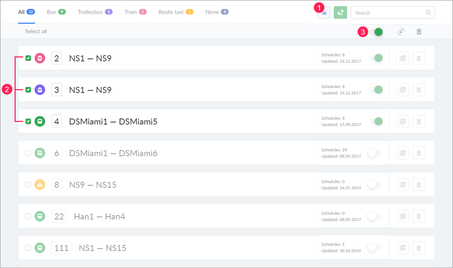 You can perform such bulk operations with routes as switching on/off, associating units, and deletion.