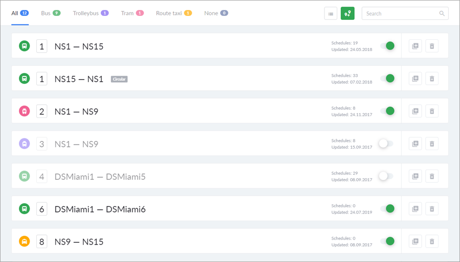 For each route, the number of schedules and the date of the last update are indicated. To view or edit the properties of a route, click on the line with its name.
