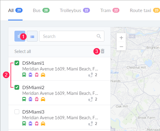 - Select the stops you want to delete (2). To select or reset the selection of all items at the same time, click Select all/Reset selection.