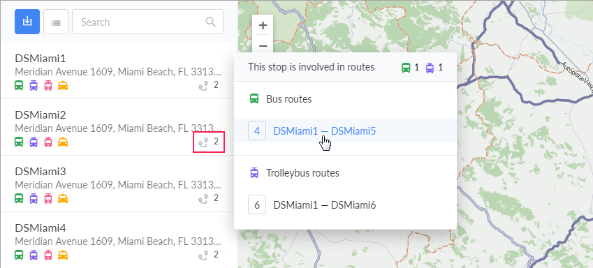 The created stops are displayed as a list on the left side of the screen. The data about a stop includes its name, description (if specified), type (types), and information about the routes it is used in. When pointing to a stop, the buttons for its editing and deleting appear in the list.