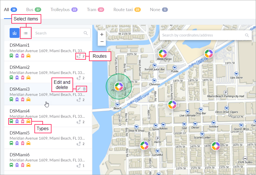 Stops can be filtered by type, to show, for instance, only trolleybus ones. To do this, select the required tab in the header of the work area. To quickly search for stops, you can use the dynamic search located directly above their list. The search works both by name and by description. When you apply filtering and search, the contents of both the list and the map are changed.