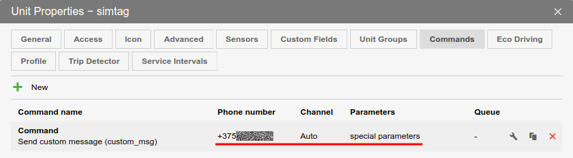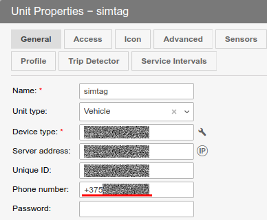 In the General tab in the unit properties, you must specify the Phone number in international format, to which the tracker will receive SMS.