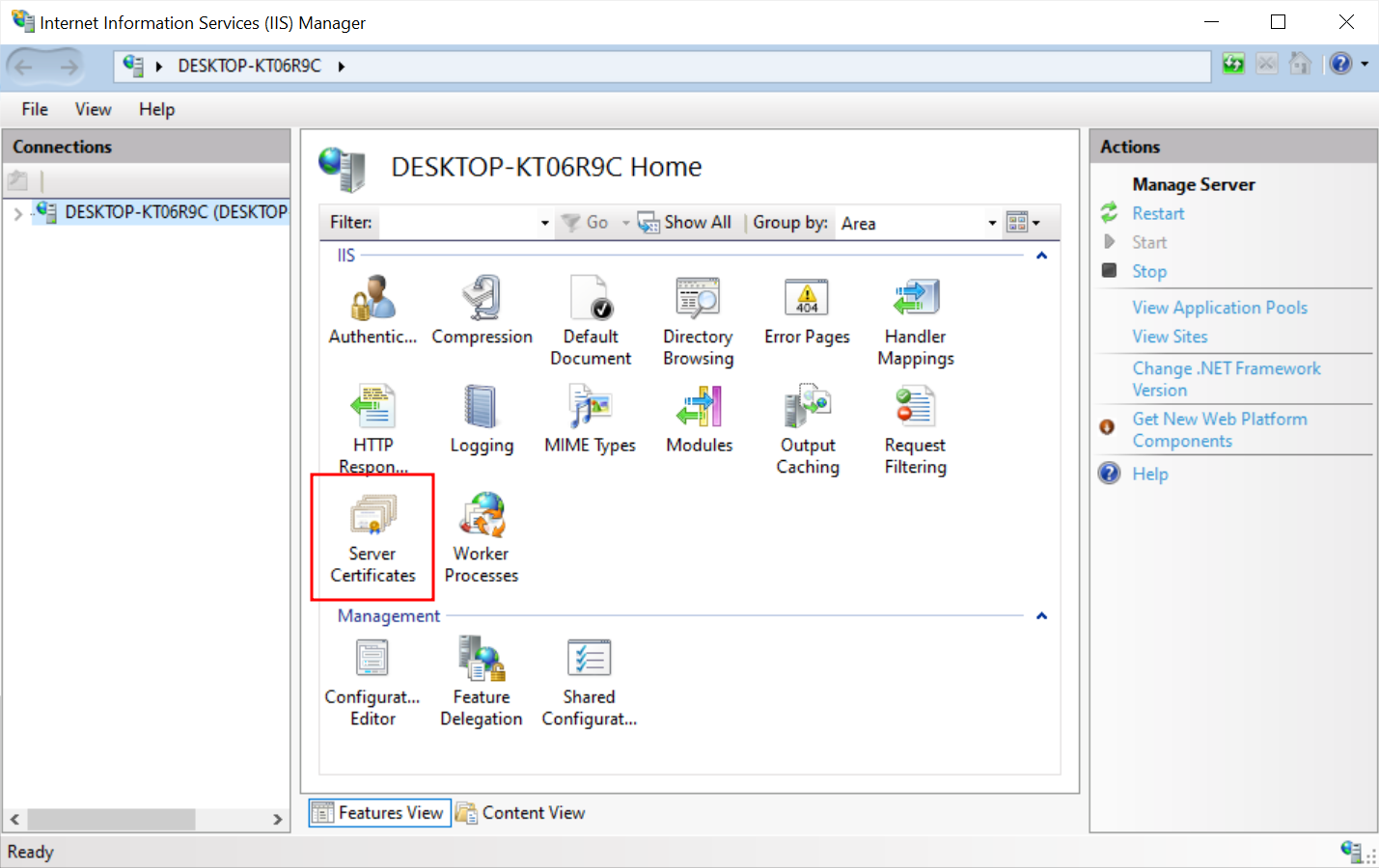 Double-click the Server Certificates icon in the center panel of the window.