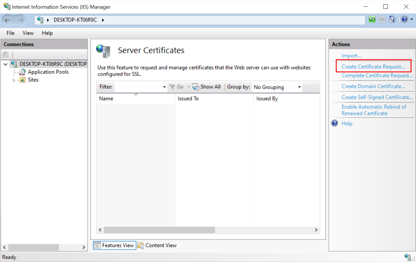 Click the Create Certificate Request link in the Actions column on the right side of the window.