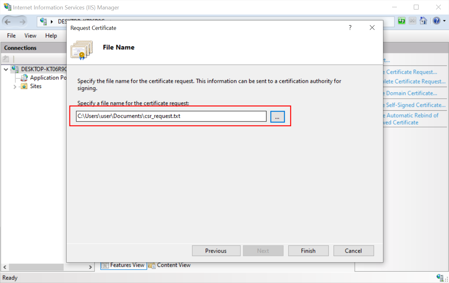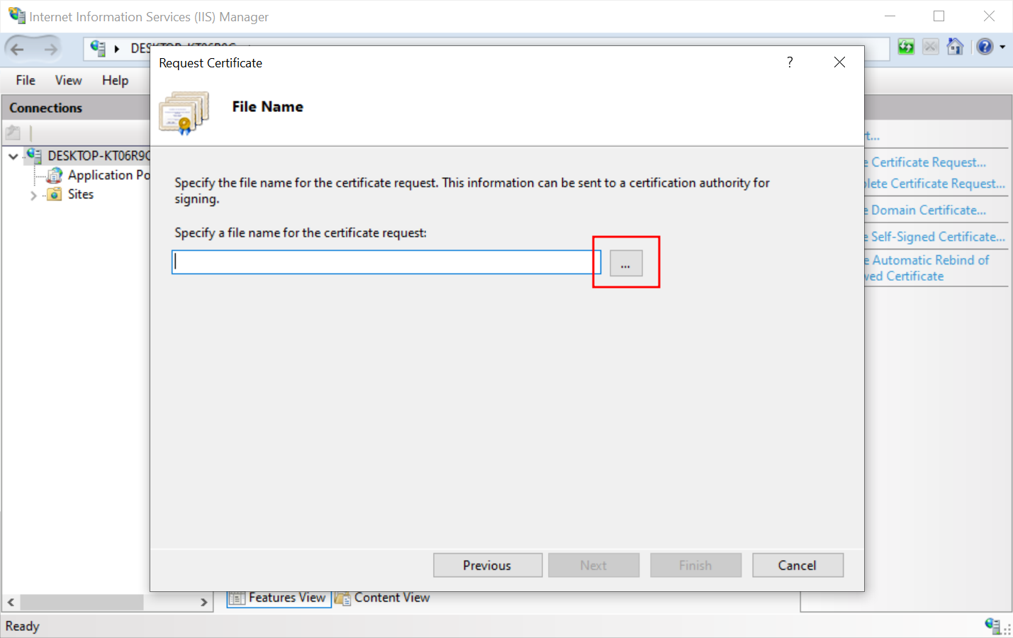 Click the button with three dots to select where the CSR request should be placed and add its name. Press Finish.