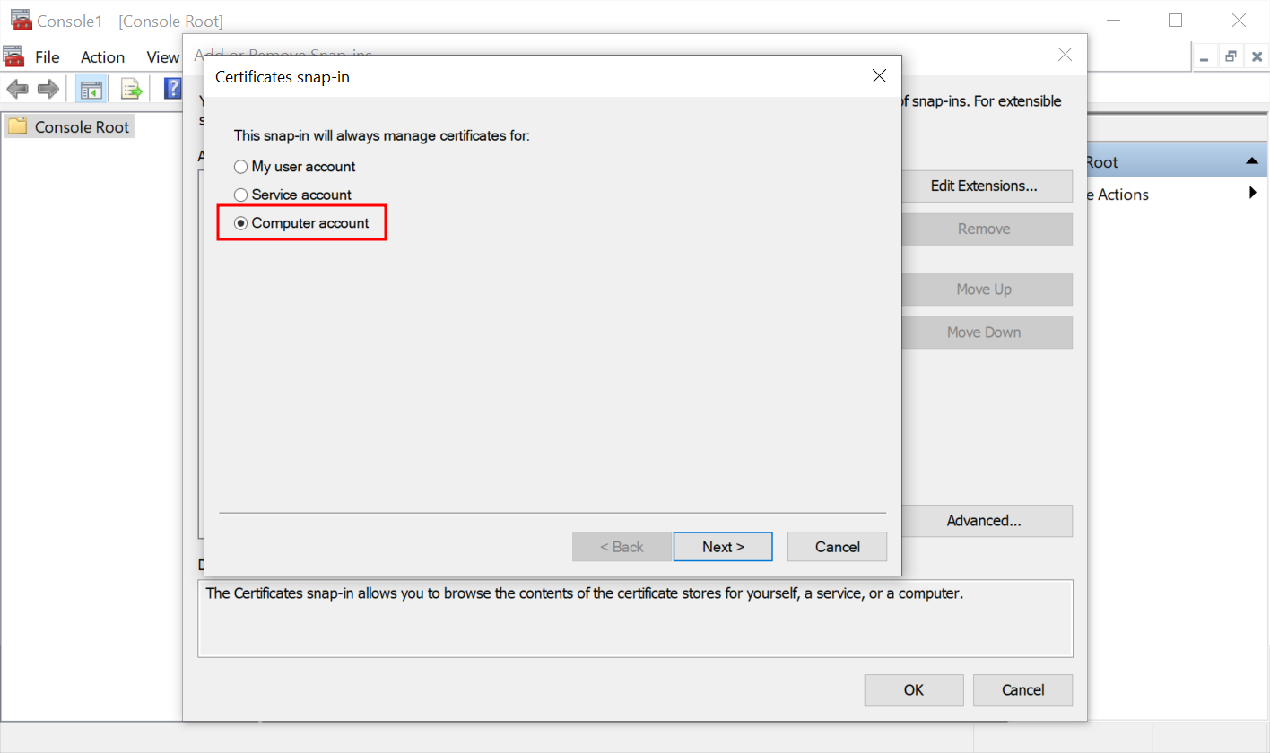 This snap-in will always manage certificates for Computer account and press Next.