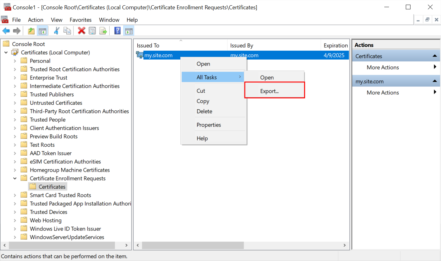 In the center panel of the window, find the required certificate request and right-click it. Select All Tasks > Export…