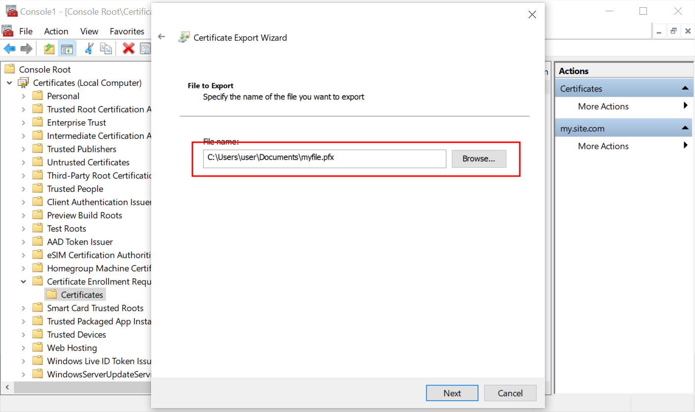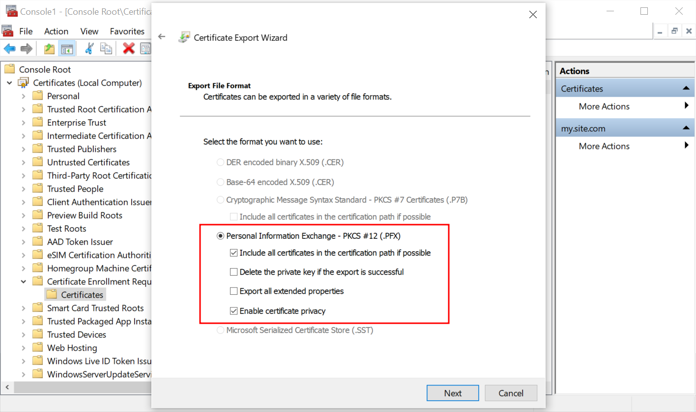 Select the format Personal Information Exchange - PKCS #12 (.PFX).