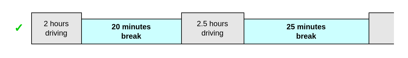 If within 4.5 hours of driving you take a break of more than 15 minutes but less than 45 minutes, then at the end of the 4.5-hour driving period, you can take a break of such duration that in total with the previous break will be equal to 45 minutes. If the break lasts less than 15 minutes, it will not be counted.