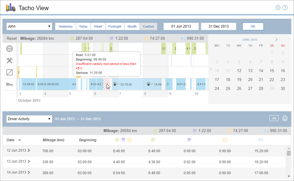 The Tacho View web application visualizes DWH information in the form of color charts and reports on driver activity or labor routine violations.