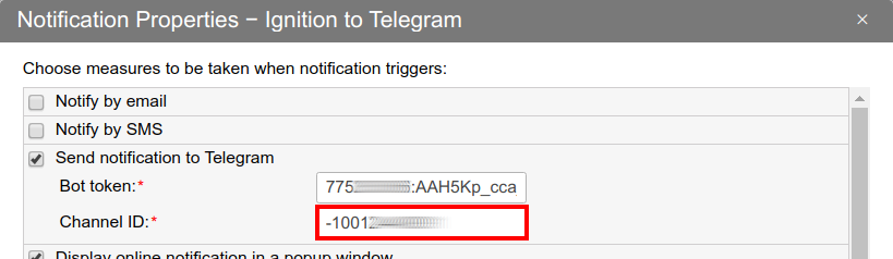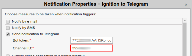 Put the channel ID in the Channel ID field for configuring notifications in Wialon: