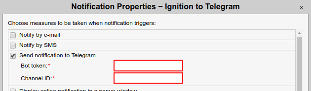 There is only one setting for Telegram notifications in Wialon — you need to set the Bot token and Channel ID: