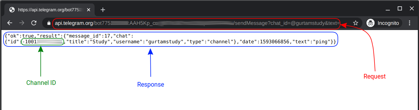 {"ok":true,"result":{"message_id":17,"chat":{"id":-1001xxxxxxxxx,"title":"Study","username":"gurtamstudy","type":"channel"},"date":1593066856,"text":"ping"}}