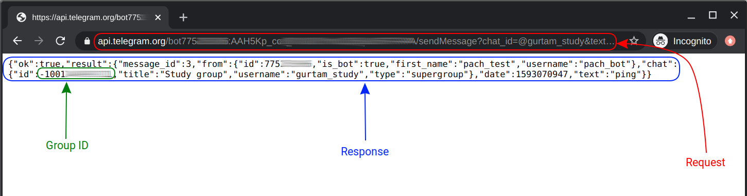 {"ok":true,"result":{"message_id":2,"from":{"id":775ххххххх,"is_bot":true,"first_name":"pach_test","username":"pach_bot"},"chat":{"id":-1001xxxxxxxxx,"title":"Study group","username":"gurtam_study","type":"supergroup"},"date":1593070025,"text":"ping"}}